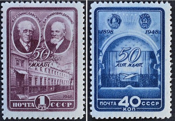 Московский Художественный-общедоступный театр был основан в 1898 году К.С. Станиславским и В.И. Немировичем-Данчеко. Юбилей театра отмечался выпуском почтовых марок с портретами его основателей. На марках показано здание театра в Камергерском переулке. Архитектор Шехтель.