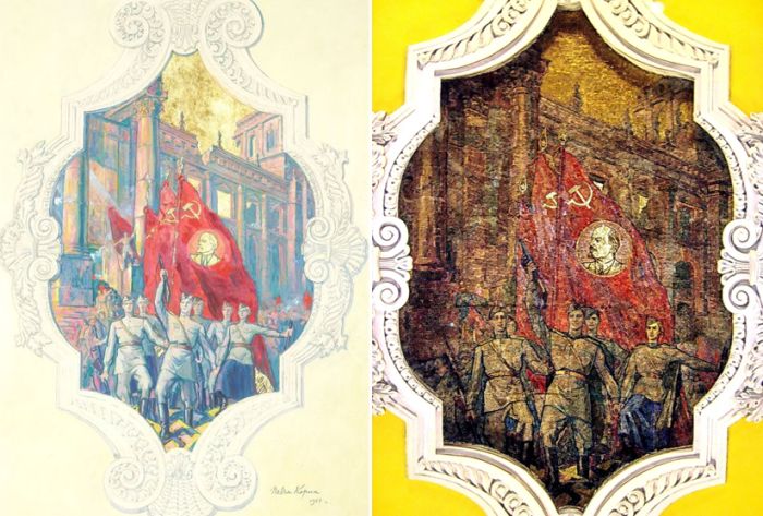 Чередуя эскизы и существующие ныне мозаики, позвольте показать, насколько схожи даже движения ступней женщины, символизирующей мир и Родины-матери. Скорее всего, такое сходство Корин придал своим героиням в качестве смыслового рефрена, тем более что станции, на которых эти мозаики помещены, разделяют только Достоевская и Проспект Мира-кольцевая.