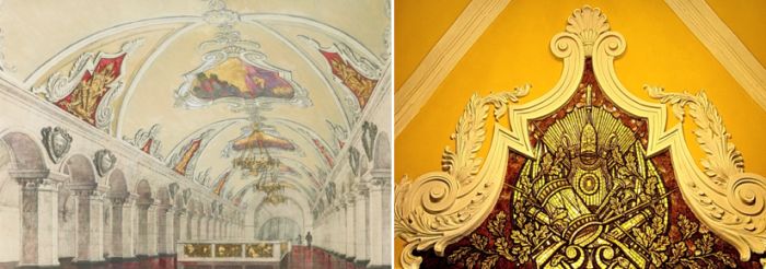 Не спешите покидать платформу. Оглянитесь по сторонам! Посмотрите на представленный Кориным эскиз, и на те полные символов русской воинской славы мозаики, которые помещены над проходами к метропоездам.