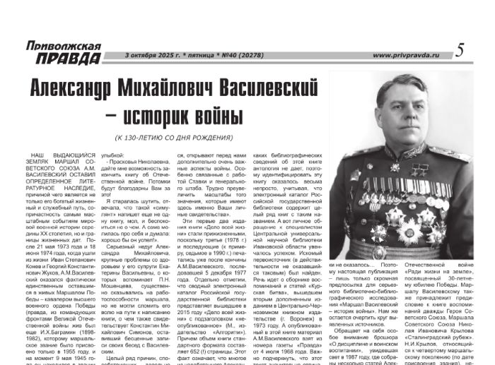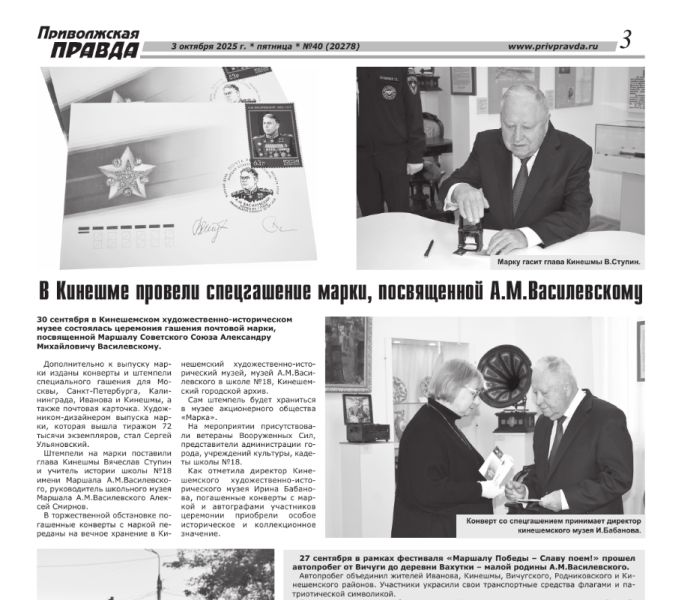 Мероприятия приуроченные к 130-летию со дня рождения маршала А.М. Василевского прошли в г.Кинешма. О них в полном объеме рассказала местная газета «Приволжская правда».