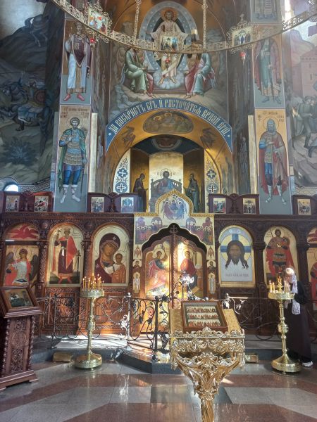 По всему периметру пантеона выложены мозаикой знамена с именами погибших защитников Сталинграда — 34 знамени, 7200 имен. Над ними — Георгиевская лента, на которой мы видим слова: «Да, мы были простыми смертными, и мало кто уцелел из нас, но все мы выполнили свой патриотический долг перед священной матерью-Родиной».