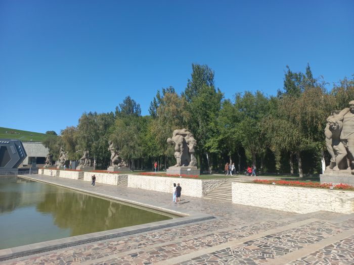 По мере движения вверх, ступенька за ступенькой, шаг за шагом, метр за метром вашему взору открываются скульптурные композиции, выполненные из железобетона, окруженные водными бассейнами, символизирующими Волгу и тополями — солдатами. Вокруг много цветов и зелени — это символ жизни и мира. Кстати, года два после войны на Мамаевом кургане ничего не росло, его склон был черным от пожаров.