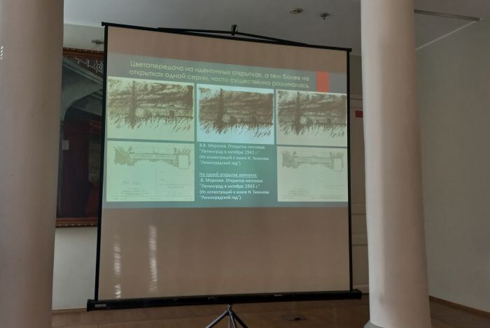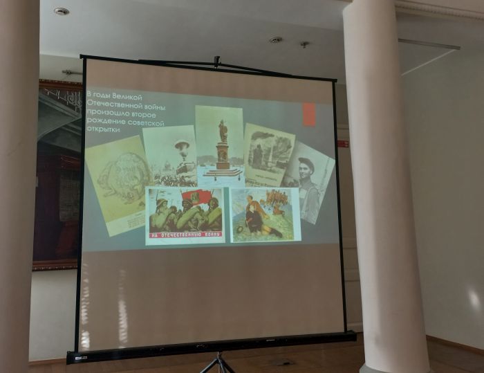 На примере коллекции музея обороны и блокады Ленинграда Наталья Евгеньевна рассмотрела феномен ленинградской открытки периода блокады и роль открыток в приближении общей Победы.