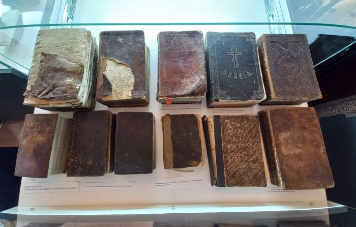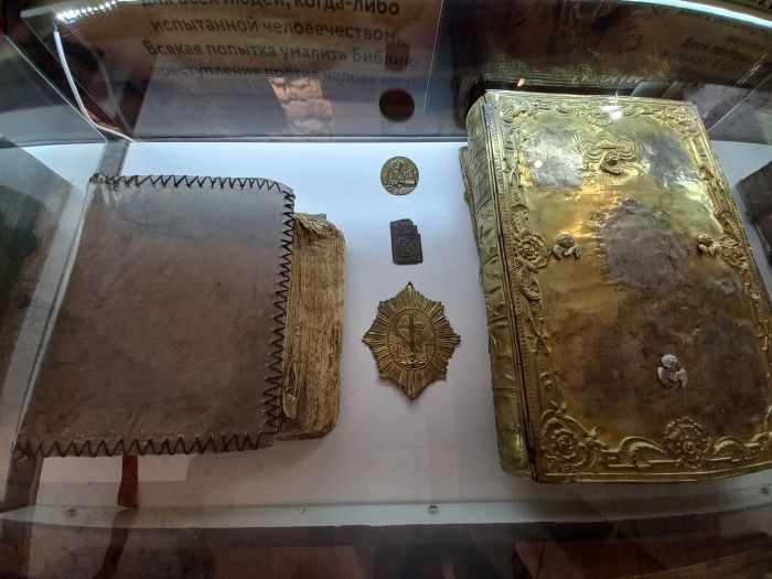 Вот как, к примеру, эта именная Библия (на нижнем фото слева). Толстая, потрепанная книга. Судя по всему, пользовались ею часто, с любовью и почтением...