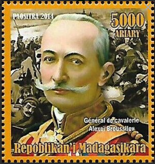 Второй по счёту войной в героической биографии Дмитрия Михайловича Карбышева была Первая мировая война. Под командованием генерала от кавалерии Алексея Алексеевича Брусилова Дмитрий Карбышев доблестно сражался в Карпатах в составе Восьмой армии Юго-Западного фронта. Портрет командира Алексея Алексеевича Брусилова запечатлён на почтовой марке Мадагаскара 2014 года выпуска из серии «Первая мировая война».
