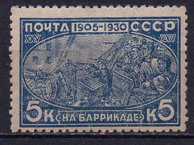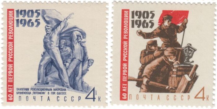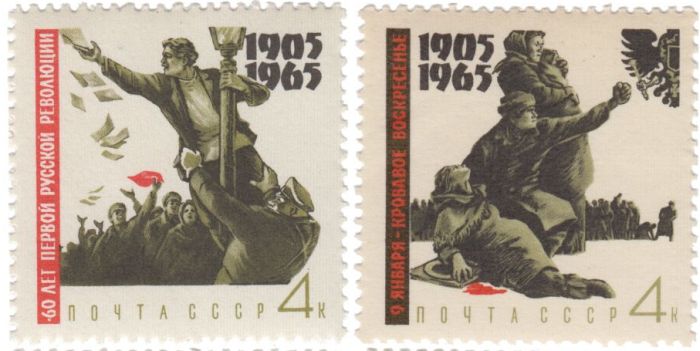 В 1965 году широко отмечалось 60-летие Первой русской революции. Серия из четырех почтовых миниатюр квадратного формата рассказывает о разных эпизодах времен революции 1905 года (художник В.Пименов). Для этих марок характерно смелое графическое решение в духе 1960-х годов.