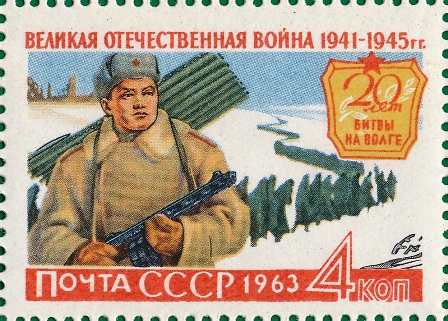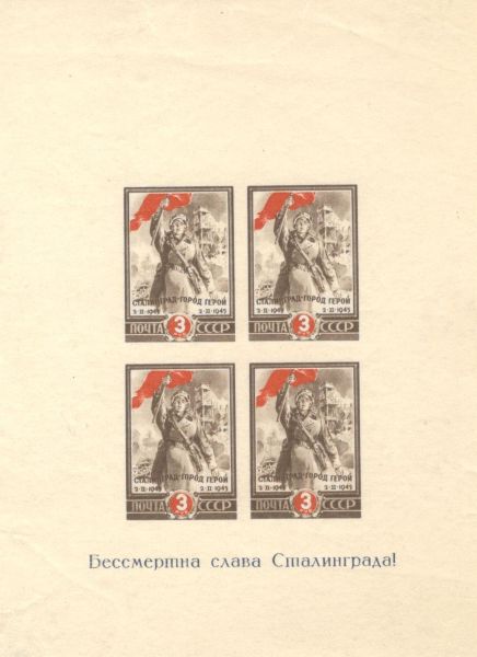 В 1945 году была выпущена серия «Сталинград». Она состояла из двух марок и блока. Серия посвящена 2-ой годовщине разгрома фашистов под Сталинградом. Сюжет — советский воин со знаменем на фоне руин города.