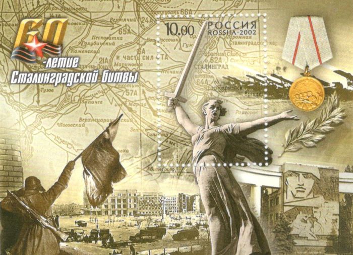 В 2002 году в России, к 60-летию Сталинградской битвы, был выпущен блок. На нем изображено поднятие флага Победы над городом, барельеф «Дома Павлова», медаль «За оборону Сталинграда». Также мы видим памятник-ансамбль героям Сталинградской битвы, фрагмент которого изображен на марке. Он был открыт на Мамаевом кургане в 1967 году. Руководитель авторского коллектива - скульптор Е.В. Вучетич.