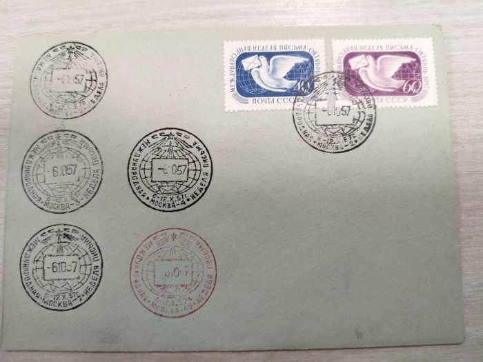 Неделя письма — очень специфический праздник, интересный по преимуществу коллекционерам. Но она неплохо выявляет, что волнует людей помимо почты. Например, коллекционер из Таллина поставил спецгашение на марки, посвященные запуску в космос первого искусственного спутника. Марки выпустили только через месяц после события, к 4 ноября. Неделя письма к этому времени уже прошла, но коллекционер год хранил их и использовал в 1958.