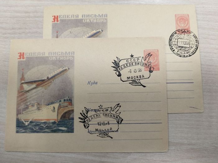 Эти конверты выпущены в 1958 году. На первом — два новеньких штемпеля этого года — поставлены в первый и в последний день Недели письма. Неделя точно совпадает с нашей: с 6 по 12 октября. А круглый штемпель на втором конверте — «прошлогодний». На нем перевели дату и снова использовали для спецгашения.