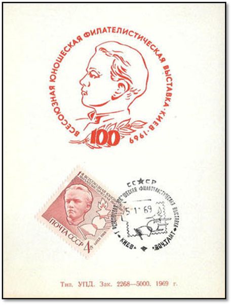 «1 ВСЕСОЮЗНАЯ ЮНОШЕСКАЯ ФИЛАТЕЛИСТИЧЕСКАЯ ВЫСТАВКА. ДЕНЬ ЛЕНИНСКОЙ МАРКИ» КИЕВ.ПОЧТАМТ 9 XI-69»