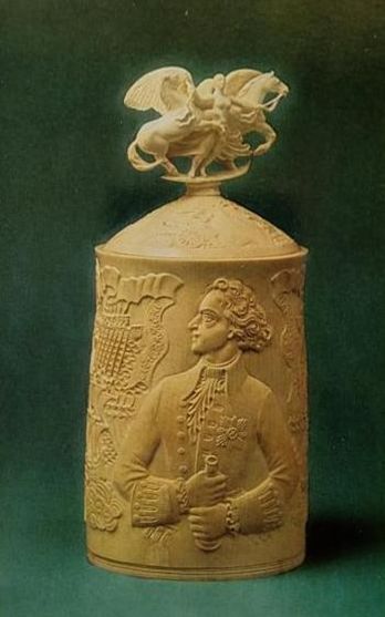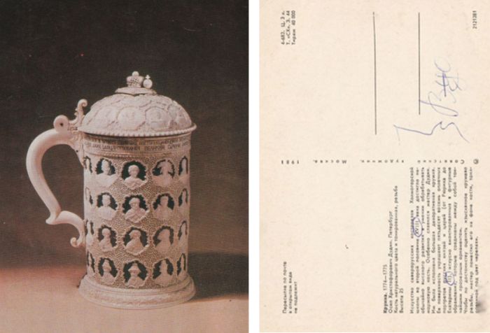 На поверхности кружки высотой всего 25 сантиметров, выполненной в 1774-1775 годах, холмогорский резчик Осип Христофорович Дудин смог поместить полсотни портретов правителей от Рюрика до Екатерины Великой. Один из профилей этого беспрецедентного изделия можно увидеть на многоцветной двусторонней репродукционной открытке издательства «Советский художник» 1981 года выпуска.
