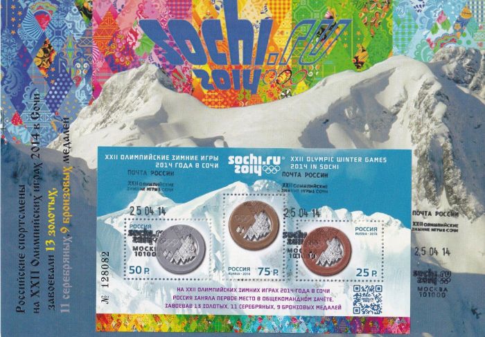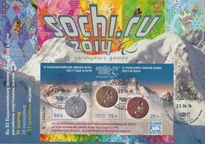 Жена всю Олимпиаду-2014 провела в Сочи, трудясь волонтером при МОК Греции. Она посетила все спортивные мероприятия, включая Открытие и Закрытие. А я сделал карточки и погасил их переводным штемпелем. Причем с номерными блоками Олимпийских и Паралимпийских игр. Формат карточек, правда, необычный — А5.