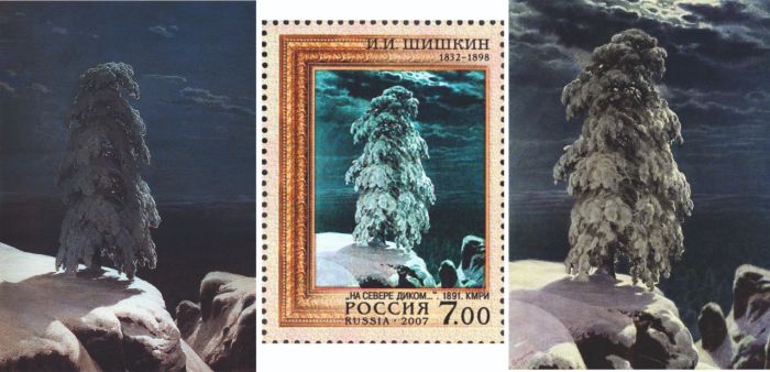 — Современные художники не впечатляют. А вот с «классикой» иногда случаются казусы. В 2007 году, к юбилею Шишкина, было выпущено две марки. Одна из которых — «На севере диком», из Киевского музея русского искусства (КМРИ). Когда начал работать над макетом, то выяснилось, что на марке изображена не репродукция картины из Киевского музея русского искусства, а эскиз к картине, выполненный годом ранее, который находится запасниках Третьяковской галереи. Вот, можете сами наглядно сравнить. Слева — репродукция картины из КМРИ, 1891 года, в середине репродукция марки, а справа — репродукция из Третьяковской галереи, 1890 года.