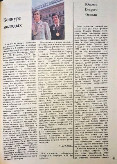 На одном из заданий этого конкурса командам предлагалось оформить выставочные листы. Участникам давали одинаковые пакеты с венгерскими марками, из которых нужно было обозначить тему, скомпоновать марки, придумать и написать текст, обрезать клеммташи и смонтировать на листах материал, таким образом сделать мини-экспонат. А для реализации этого необходимо было знать историю Венгрии и хорошо ориентироваться в её филателистическом материале. Были и ещё несколько заданий, на которых даже пришлось взять гитару и спеть дуэтом. Естественно, мы с напарником Петей Нагульновым лучше всех это сделали, поскольку у нас был приличный опыт, и в итоге заняли первое место. Это было довольно яркое, запоминающееся на всю жизнь событие! Победа немного меня взбодрила. Именно тогда я вновь почуял запах филателии, но велосипед сильно притормозил этот порыв…