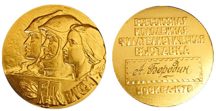 Золотая медаль Всесоюзной филателистической выставки «60 лет ВЛКСМ» (аверс и реверс)