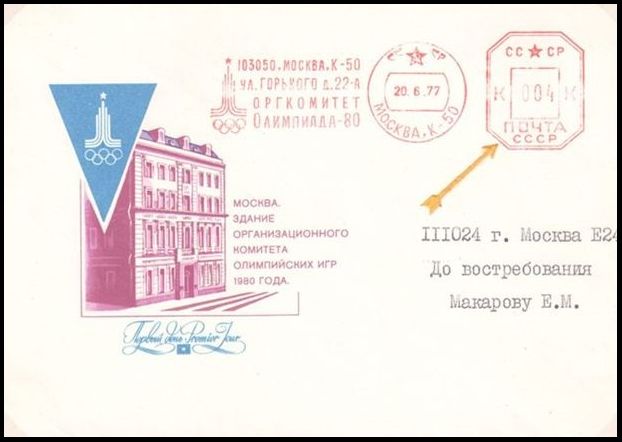 Конверт от письма, отправленного из Олимпийского комитета с машинным штемпелем. 1977 г.