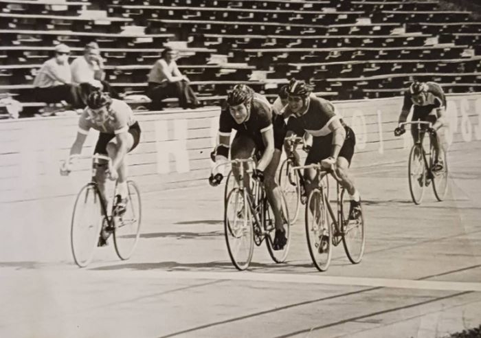 В гонке чемпионата СССР на треке. Ленинград, 1976 г. (в центре)