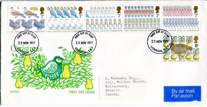 А вот один из конвертов выглядит довольно необычно. Мы видим куропатку, сидящую на грушевом дереве, а на марках ещё что-то более непонятное — по нескольку рядов всяких странных персонажей птиц, танцоров, музыкантов, в общем, всякой всячины...