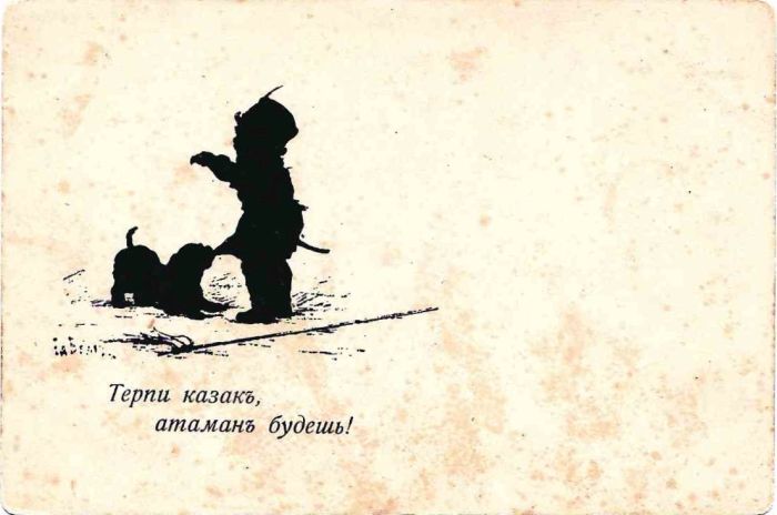 Елизавета Бём — один из самых популярных дореволюционных художников. У нее не было проблем с деталями и цветовым решением — чтобы в этом убедиться, можно посмотреть на трогательные новогодние открытки ее работы. Но в этот раз оказалось достаточно силуэта, чтобы показать проблему ребенка, которого за штаны тащит куда-то щенок.