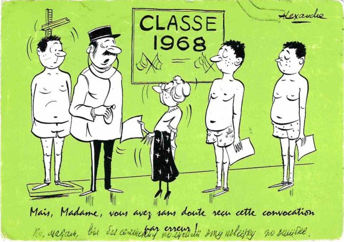 Сценка со старой французской открытки — впору для комедийного фильма. Старушка так серьезно относится к документам, что без колебаний явилась на призывной пункт и подготовилась к осмотру. Сможет ли доктор ее переубедить? Подпись гласит: «Но, мадам, вы, безусловно, получили эту повестку по ошибке!»
