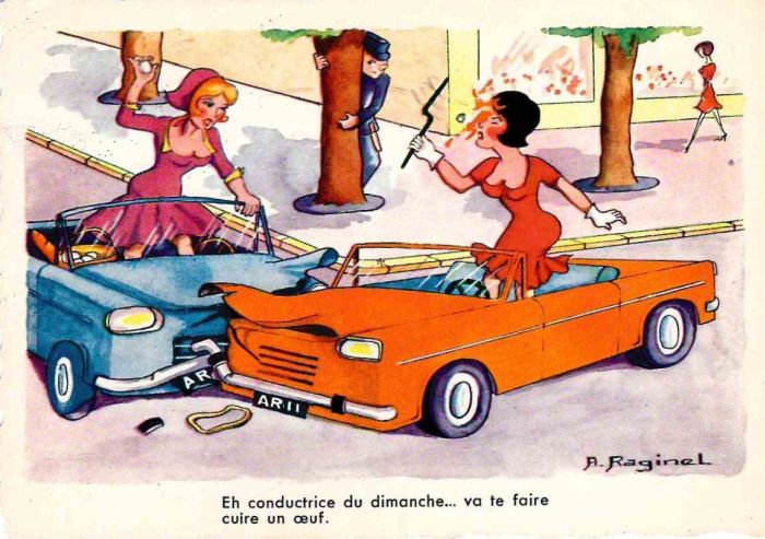 Зарубежные открытки 30-х годов не прочь подшутить над женщинами за рулем. Дамы на открытке способны постоять за себя. Когда дело доходит до монтировки и яиц (кто-то явно ездил за продуктами), даже полицейский предпочитает спрятаться за дерево.