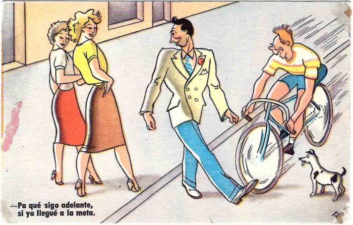 Обвинять художников не стоит: на этой открытке они показали, что мужчины могут устроить ДТП ничуть не хуже. Причем по самой нелепой причине — засмотревшись на проходящих барышень. Подпись намекает, что в ЧП виновато не простое желание поглазеть, а самая настоящая любовь: «Зачем мне двигаться дальше, если я уже достиг цели».