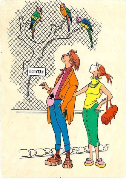 Иногда ирония оказывается действительно забавной. Пара у клетки с птицами одета так пестро, что уже невозможно понять, к кому относится вывеска «Попугаи». Смотреть на них без смеха трудно.