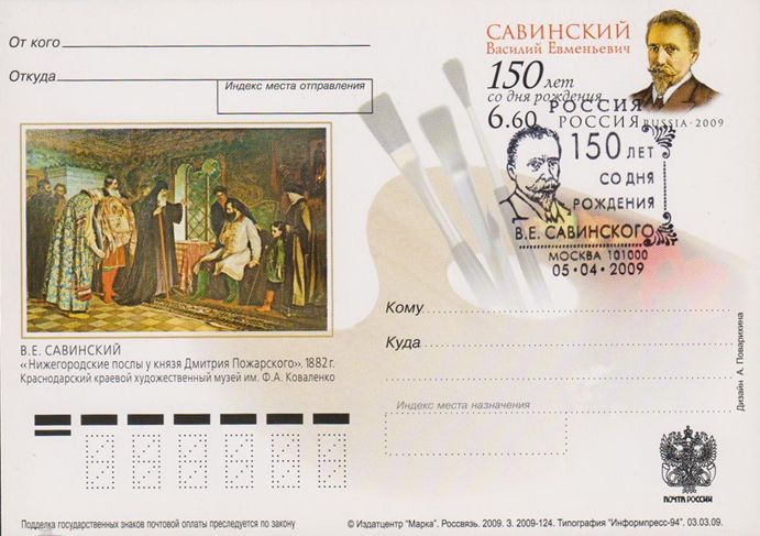 К 5 апреля 2009 года дизайнером А. Поварихиным оформлена карточка с оригинальной маркой № 194/окр-09 «150 лет со дня рождения В.Е. Савинского, живописца, портретиста и педагога».