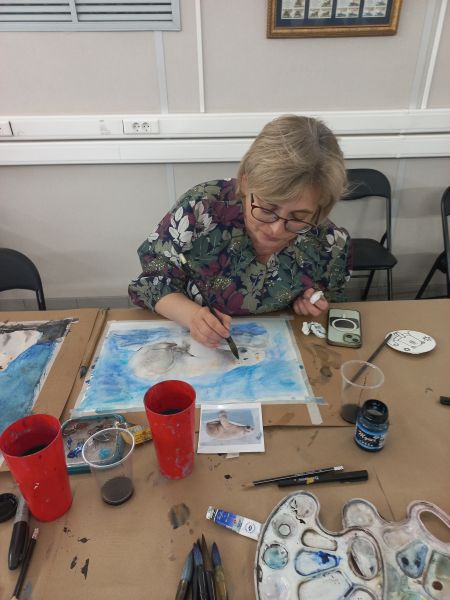Так, подождите. А где же соль и скомканная бумага? Все это нам понадобилось во второй части встречи, когда художник, арт-педагог и арт-терапевт Юлия Белокрылова предложила нарисовать белого медведя.