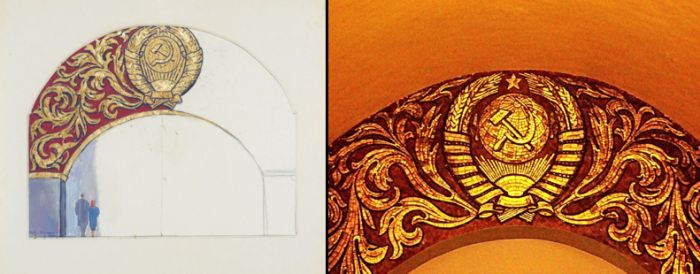 И над всем этим – герб СССР, хорошо заметный на эскизе торцевой стены.