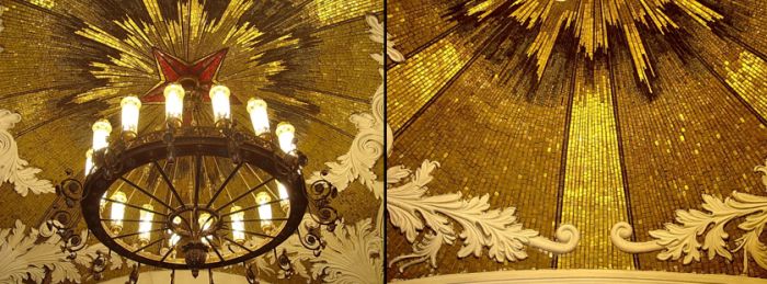Эту площадку освещает шестнадцатиламповая люстра, закреплённая в центре мозаики, изображающей красную армейскую звезду. Саму мозаику гораздо легче рассмотреть по коринскому эскизу. Отойдите немного в сторону, и вы увидите, как мозаичистами был воплощён коринский замысел.