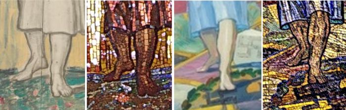 Чередуя эскизы и существующие ныне мозаики, позвольте показать, насколько схожи даже движения ступней женщины, символизирующей мир и Родины-матери. Скорее всего, такое сходство Корин придал своим героиням в качестве смыслового рефрена, тем более что станции, на которых эти мозаики помещены, разделяют только Достоевская и Проспект Мира-кольцевая.