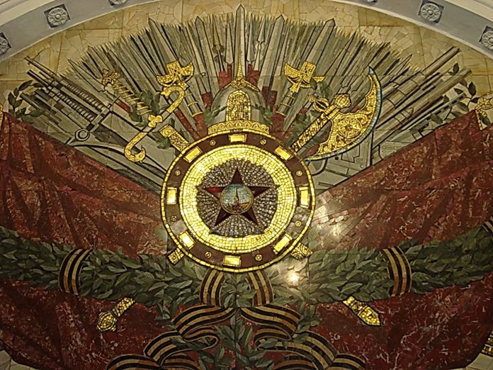 И последнее, что мы увидим, перед тем как попрощаться со станцией, будет заключительная коринская мозаика перед подъемом на эскалатор, также изображающая орден Победы в окружении старинного русского оружия и лаврового венка Славы, заботливо перевитого Георгиевской лентой.