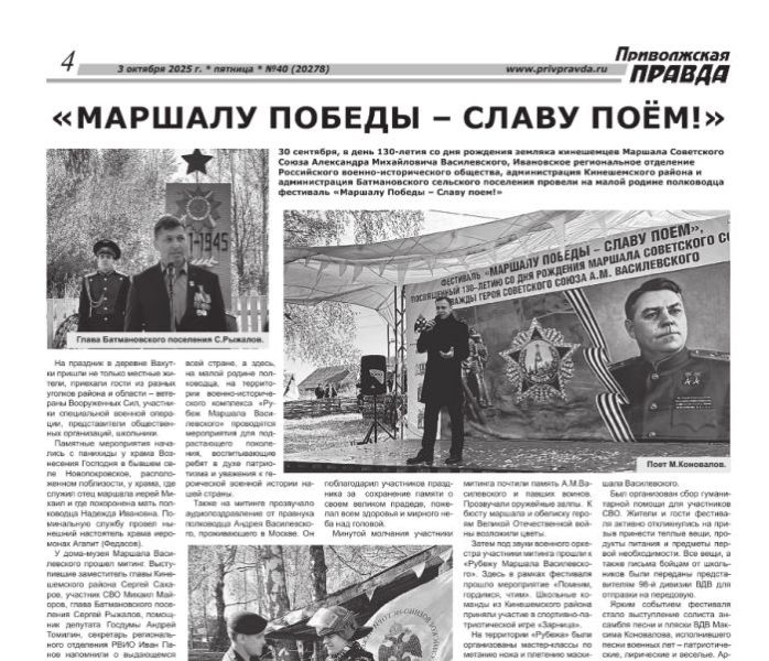 Мероприятия приуроченные к 130-летию со дня рождения маршала А.М. Василевского прошли в г.Кинешма. О них в полном объеме рассказала местная газета «Приволжская правда».