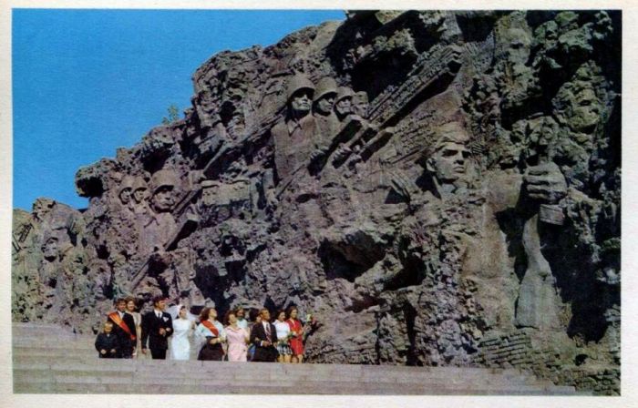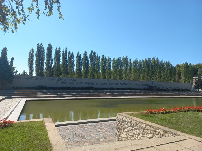 По мере движения вверх, ступенька за ступенькой, шаг за шагом, метр за метром вашему взору открываются скульптурные композиции, выполненные из железобетона, окруженные водными бассейнами, символизирующими Волгу и тополями — солдатами. Вокруг много цветов и зелени — это символ жизни и мира. Кстати, года два после войны на Мамаевом кургане ничего не росло, его склон был черным от пожаров.
