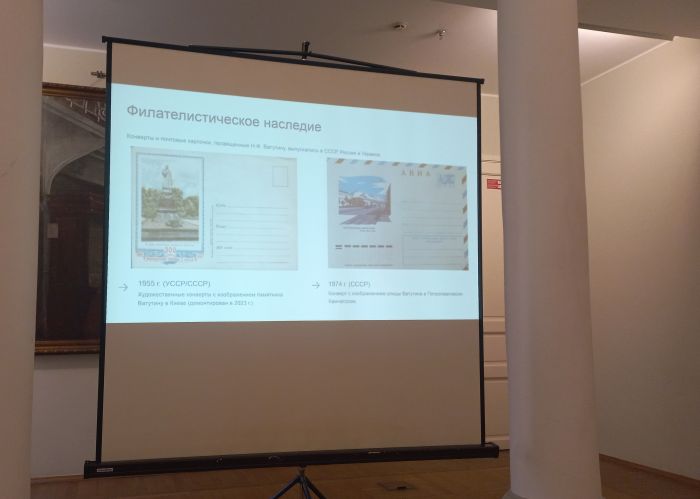 Светлана Михайловна Мишурова, Председатель воронежского отделения СФР, в своем докладе «Ватутин Н.Ф. На государственных знаках почтовой оплаты» рассказала о том, какие филателистические материалы выпущены в честь Николая Фёдоровича Ватутина в СССР и современной России, а также напомнила о значимых исторических вехах Воронежа, связанных с личностью прославленного генерала.
