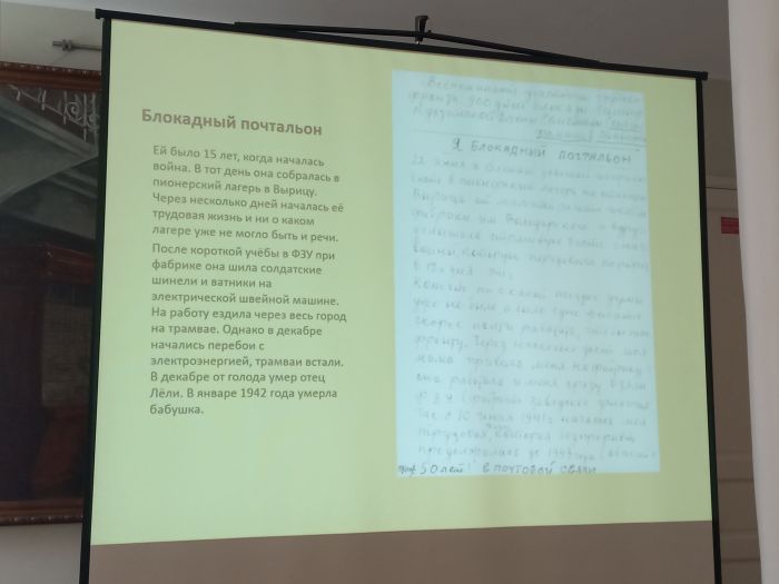 Надежда Ивановна Лосич, заведующая отделом документальных фондов ЦМС имени А.С. Попова, в докладе «Блокадная почта глазами юного вестника войны», рассказала о ленинградке Лёле Кухтинской, которой во время блокады было всего 15 лет. Все это страшное время девочка работала почтальоном. Об этом она поведала сама, когда пришла в Музей связи и принесла старые письма, открытки, документы.