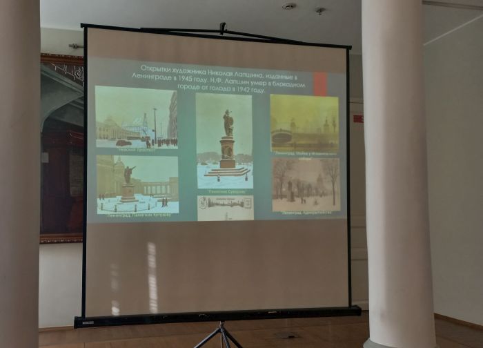 На примере коллекции музея обороны и блокады Ленинграда Наталья Евгеньевна рассмотрела феномен ленинградской открытки периода блокады и роль открыток в приближении общей Победы.