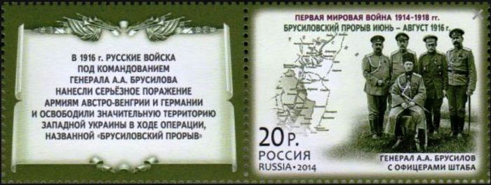 В 1917 году Дмитрий Карбышев отвечает за укрепление Восьмой армией позиций на границе с Румынией. 31 июля АО «Марка» издает серию почтовых марок «История Первой мировой войны – Военные операции (2014)», где миниатюра с купоном, имеющая в каталоге «Michel» № RU 2062Zf, посвящается успеху Брусиловского прорыва с участием Карбышева.