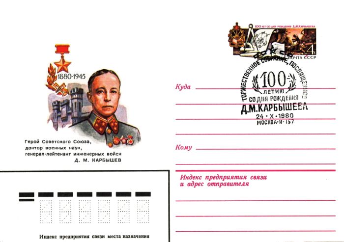 К 21 мая 1980 года Министерство связи СССР выпускает в обращение художественный маркированный конверт по рисунку А. Шмидшейна, посвящённый столетию со дня рождения Дмитрия Михайловича Карбышева (номер по каталогу Лапкина SU ASE80-307(14321).