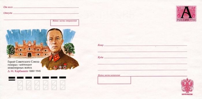 Мы видим выпущенный Министерством связи СССР художественный маркированный конверт, на иллюстрации которого запечатлён памятник Дмитрию Михайловичу Карбышеву в Москве. На территории России установлено значительное количество памятников, бюстов и мемориальных досок, посвящённых Дмитрию Михайловичу Карбышеву.