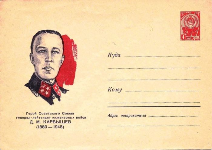 К 29 июня 1965 года Министерство связи СССР выпускает в обращение художественный маркированный конверт по рисунку П. Бенделя, посвящённый 85-й годовщине со дня рождения Дмитрия Михайловича Карбышева (номер по каталогу Лапкина SU ASE65-291).