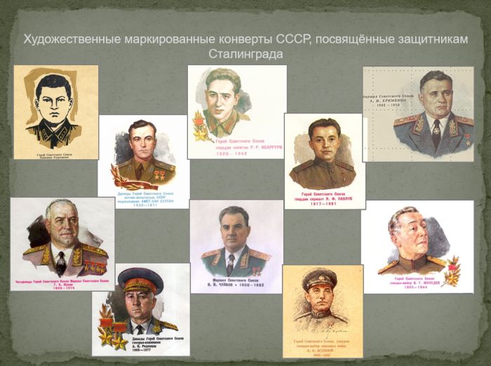 Сталинградская битва и её Герои на почтовых марках художественных маркированных конвертах СССР и России.