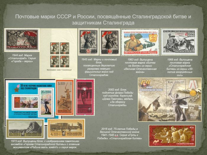 В СССР и России выпускались почтовые марки и художественные маркированные конверты, посвящённые Сталинградской битве и защитникам Сталинграда.