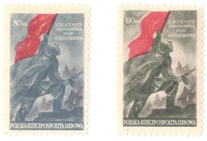 В 1945 году была выпущена серия «Сталинград». Она состояла из двух марок и блока. Серия посвящена 2-ой годовщине разгрома фашистов под Сталинградом. Сюжет — советский воин со знаменем на фоне руин города.