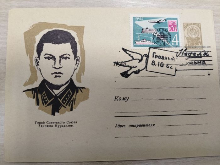 Следующий конверт — с красивым голубком на штемпеле Недели письма — настоящий раритет. Правда, в этот заслуга отнюдь не штемпеля. На конверте изображен самый результативный пулеметчик Великой Отечественной, Герой Советского Союза Ханпаша Нурадилов. За год войны 18-летний юноша уничтожил 920 фашистов, 7 пулеметных расчетов, 12 солдат взял в плен — и погиб в 1942 году.