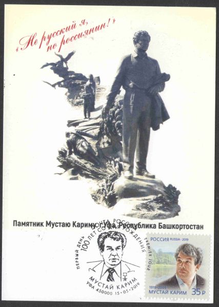 Картмаксимум о Герое Социалистического Труда, народном поэте Башкирии Мустае Кариме (1919-2005 гг.) Выполнен А.Р. Фазлыахметовым. Карточка прошла почту в день 100-летия со дня рождения писателя 15 мая 2019 г. В каталог уфимских клубных карточек ПК не включена. Тираж не известен.