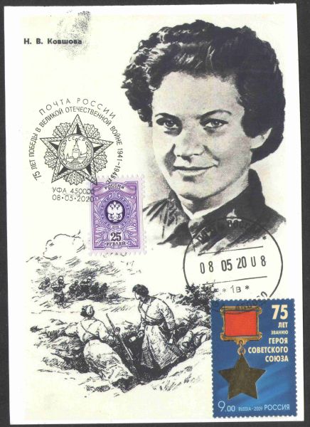 Картмаксимум о Герое Советского Союза, снайпере Наталье Ковшовой (1920-1942 гг.) Сделан А.Р. Фазлыахметовым. Прошёл почту в дни празднования 75-летия Великой Победы 8 мая 2020 г. В каталог уфимских клубных карточек не включён. Тираж не известен.