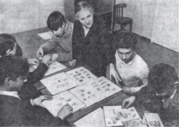 Т.С. Сотникова проводит занятие в клубе юных филателистов. 1970 г.